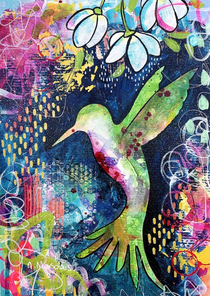 My style of work is called an intuitive painting. I tell stories in a language of layers—painted and stamped marks and patterns, vivid colors, and lots of drips of fluid paint. Figures and silhouettes eventually emerge in the final layers, like guides inviting the viewer to travel across the colorful worlds that I create