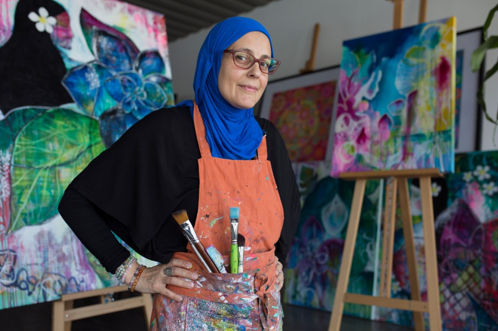 In the past, we don’t see many covered women donning a hijab in the artistic sphere, in your case, painting. What do you think is the advantage of being identified as a Muslim, or being covered as an artist? What significance does it bring to the artistic field and to Muslims?