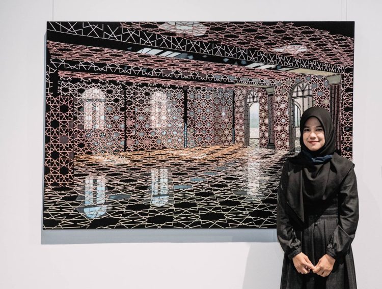 Meriam Thidarat Chantachua is a Thailand artist who uses embroidery techniques in her mixed-media art.