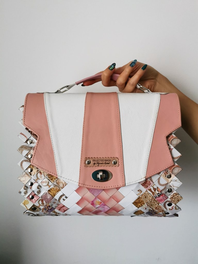 Chic, unique, stylish and eco-friendly beautiful handbag from Selected Bags, made from recycled strips weaved into a pattern of designs, with rivetted zigzag edges.