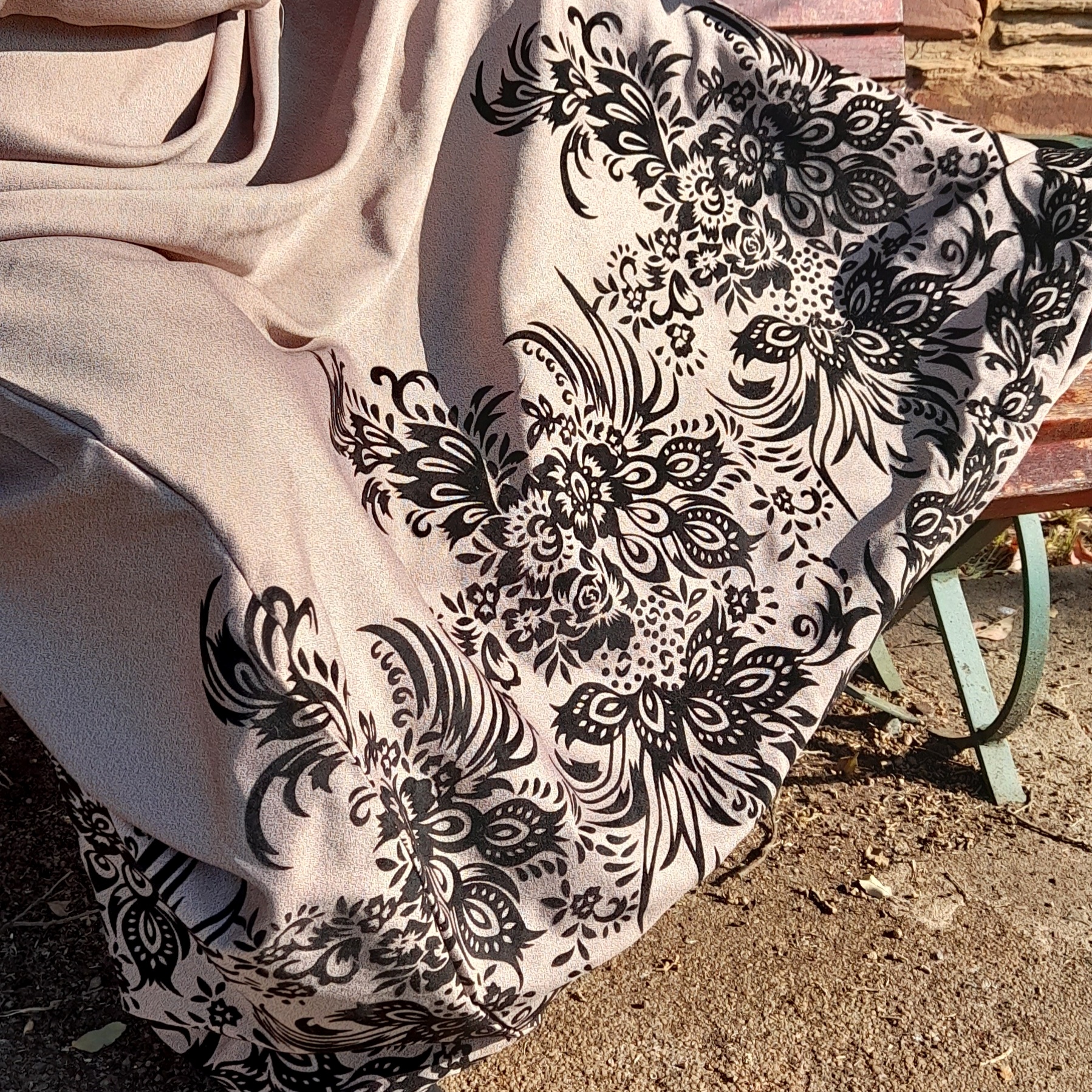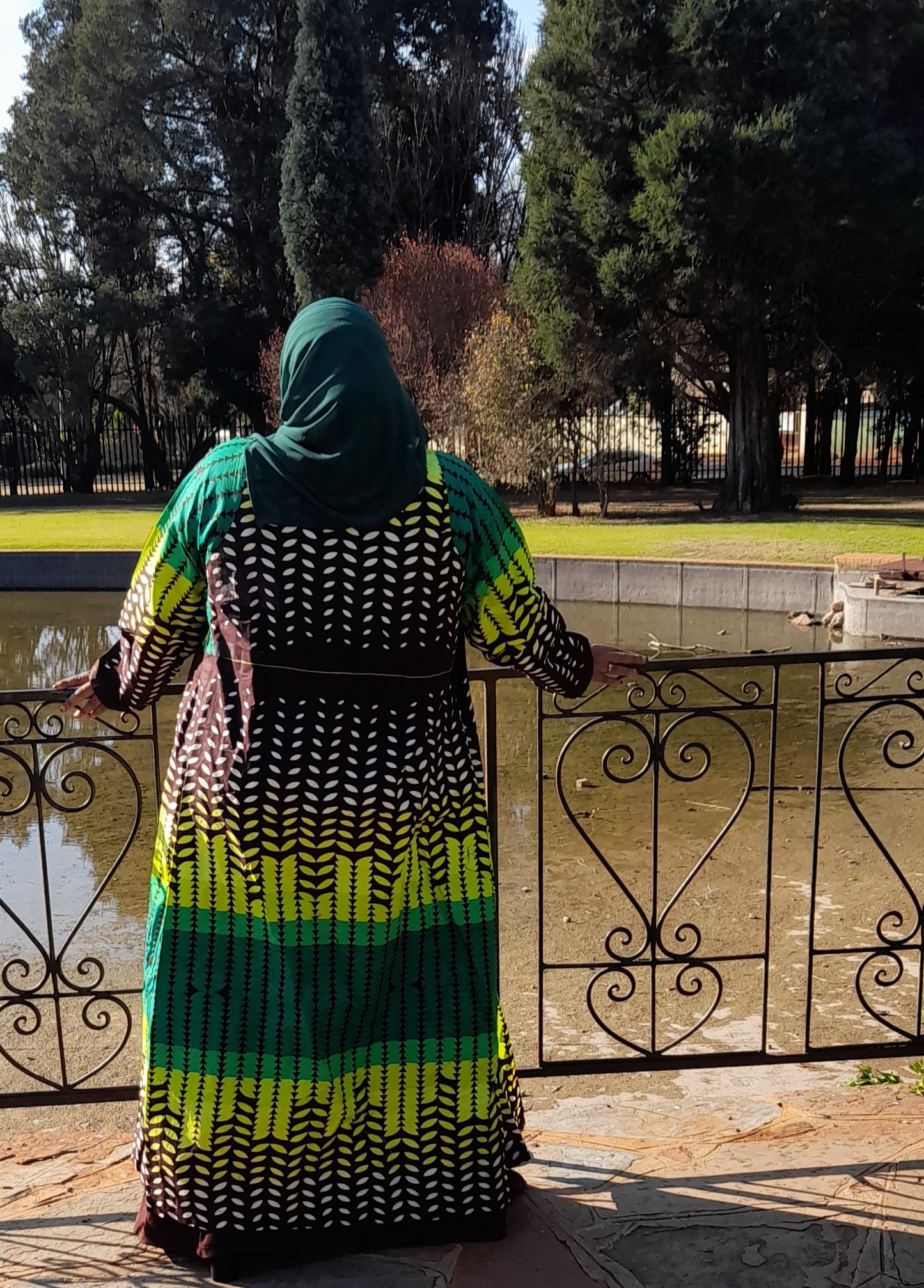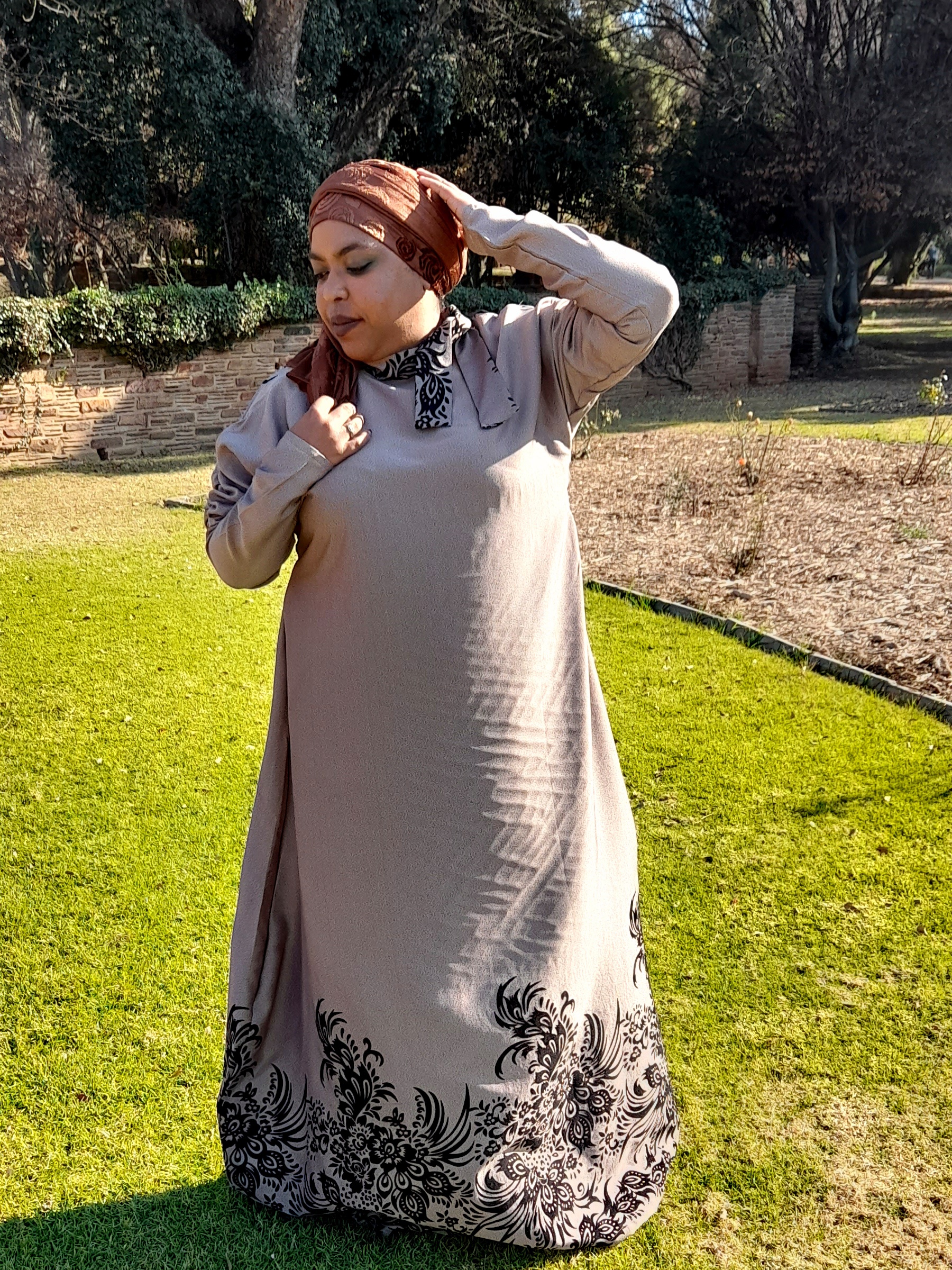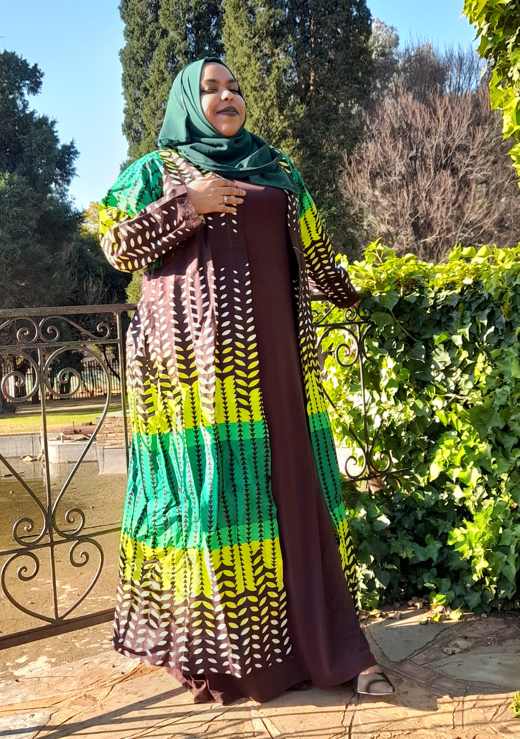 Maseeha Instyle robe in a tantalizing printed fabric which the designer Fazeela balanced with a rich brown dress and forest green scarf.