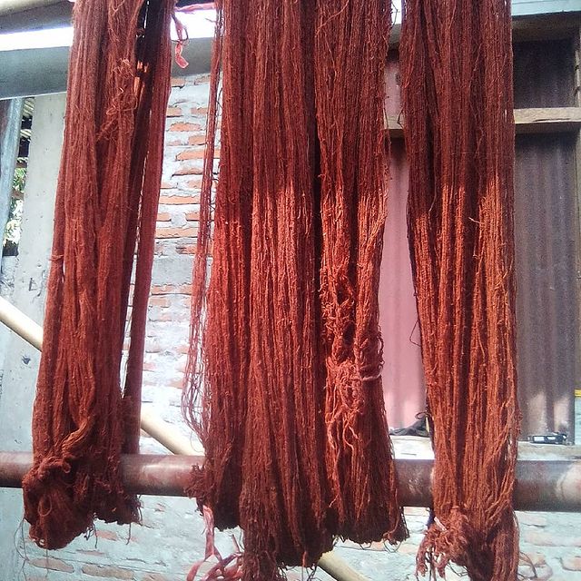 Maria admits that it is the dyeing process which takes the most part of the textile production. They still use the natural techniques of dyeing which are obtained from tinctures of natural fruit barks and roots such as turmeric, chilies, hazelnut, galangal, mahogany, indigo and ketapang or Indian almond. After dyeing they hang them for days until dried, washed again, dried and re-dyed to get the pigment to settle.